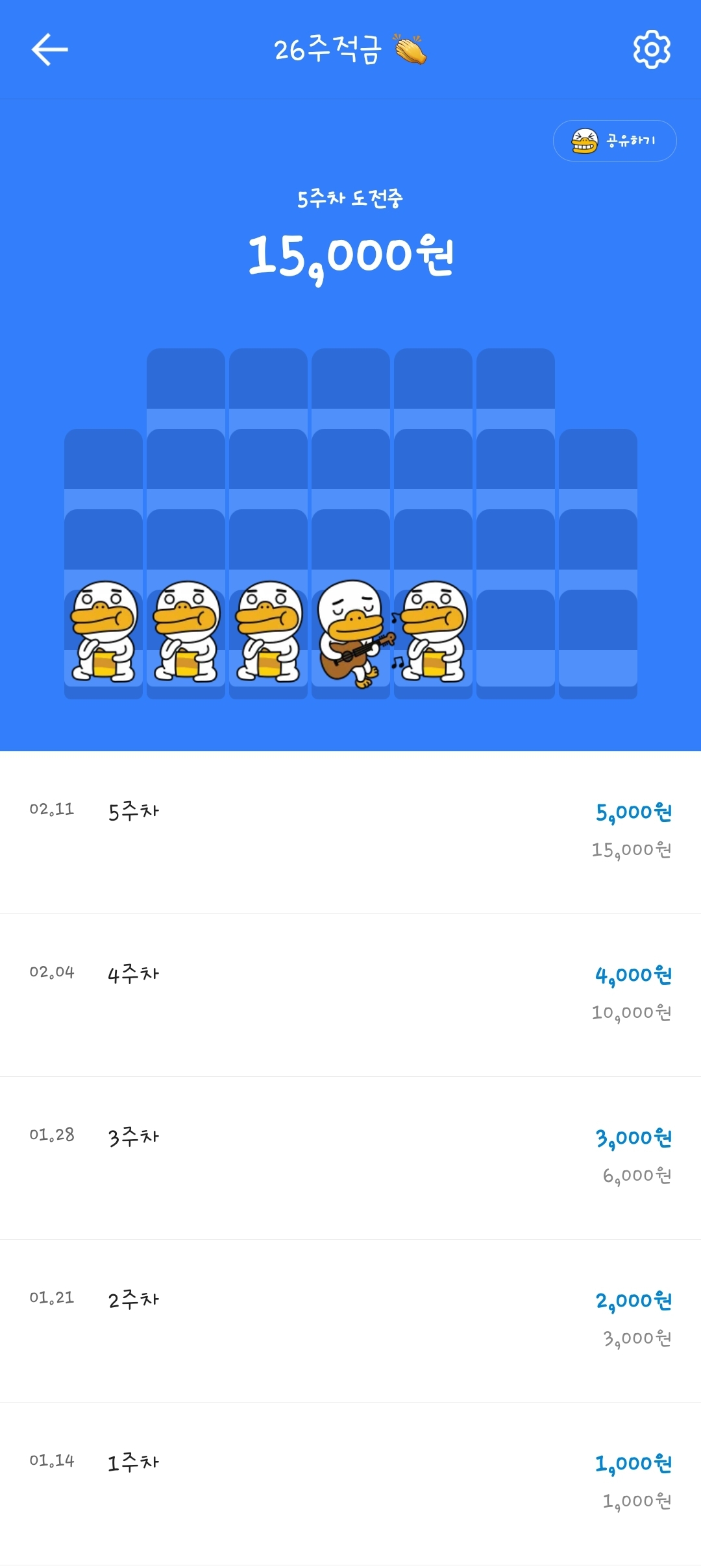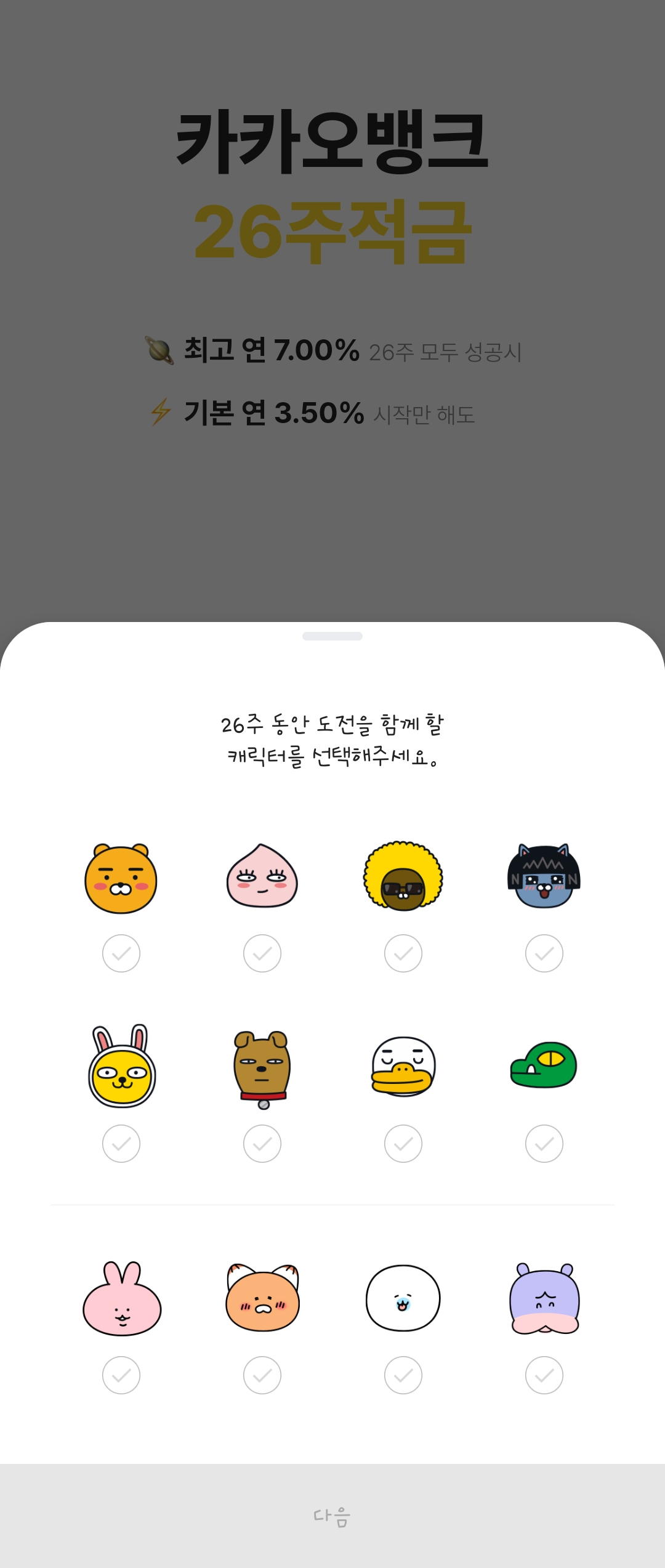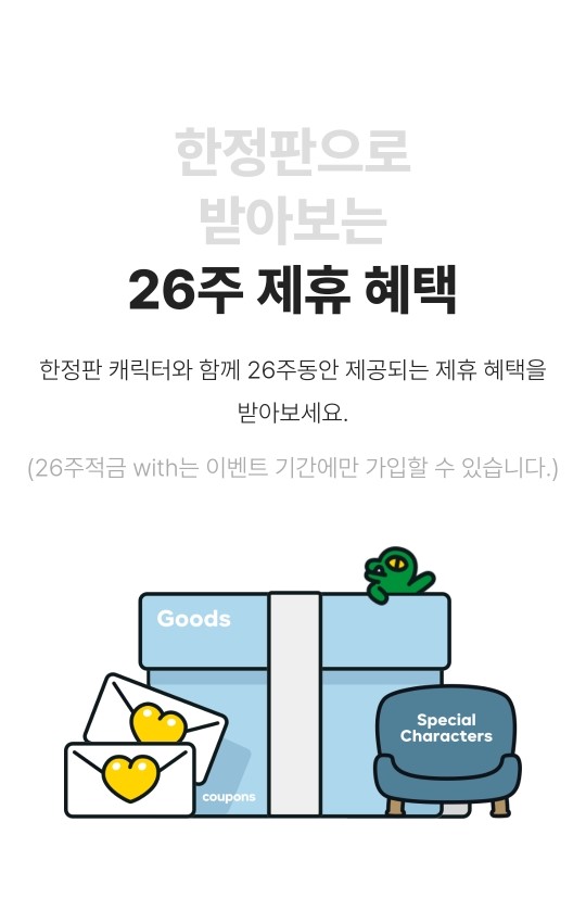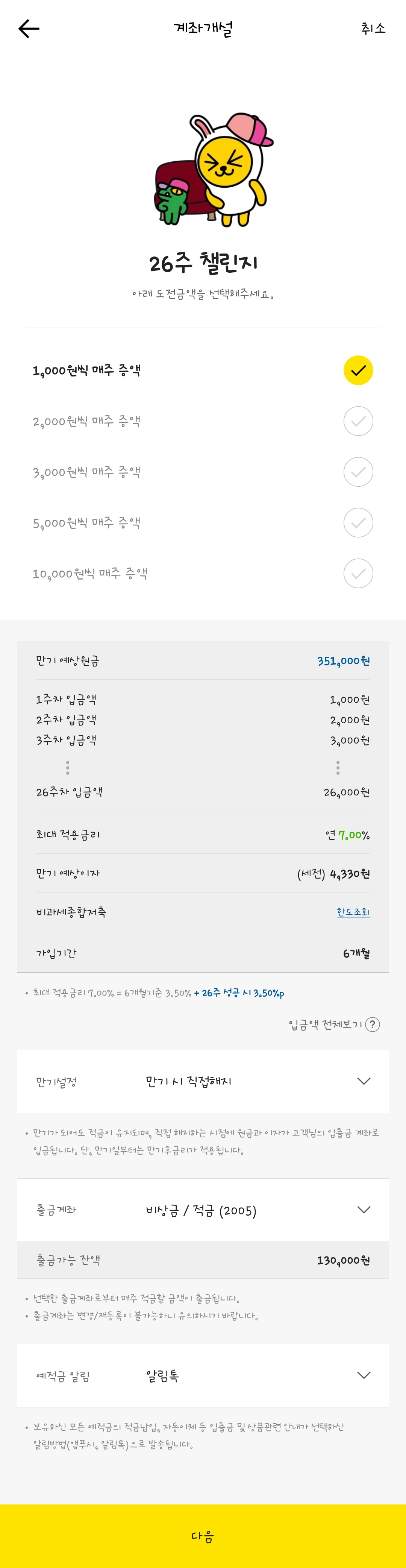 26주 동안 캐릭터와 함께 적금 챌린지를 도전하게 됩니다.매주 적금 자동이체를 성공하게 되면 이체 인증하듯이 내가 선택한 캐릭터도 한 명씩 증가된답니다. 26주 동안 매주 다양한 포즈를 가진 캐릭터가 한명씩 늘어나요~!
