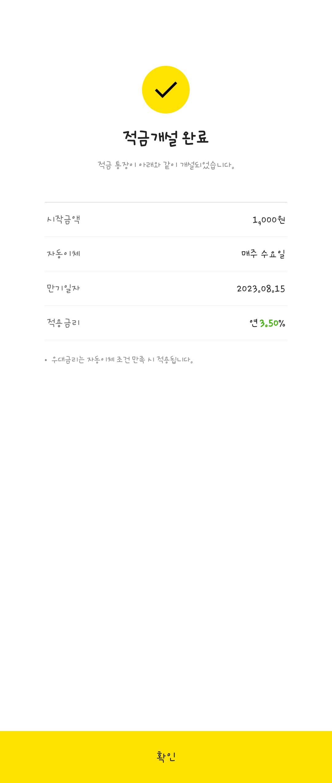 금액이 적어도 좋습니다. 도전하는 게 중요한 거니까요! 저는 2개월마다 적금 만기가 계속 돌아오도록 풍차돌리기를 할 예정이라 정말 무리되지 않는 금액인 1천 원부터 시작해 봤습니다. 처음 시도해 보고 2천 원, 3천 원 점점 늘려가는 방법도 좋습니다.